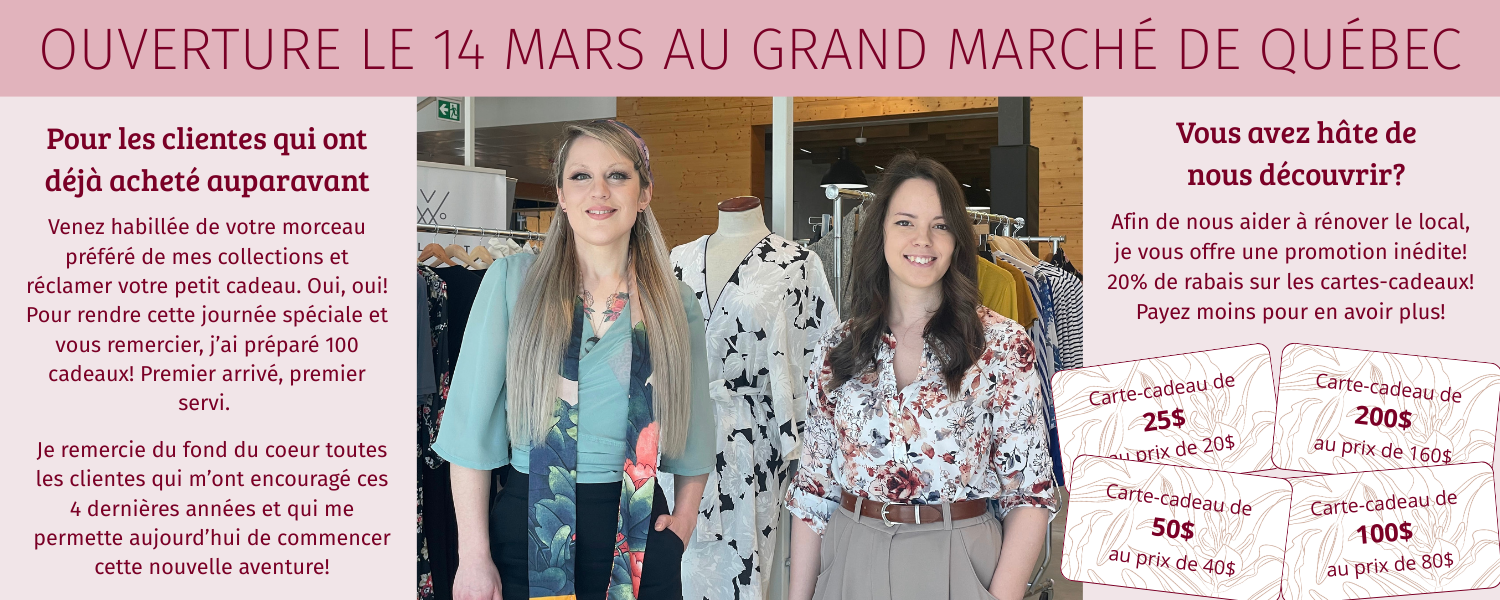Sachez que seulement certains modèles se trouvent à ces points de vente. Pour pouvoir essayer la totalité des vêtements, veuillez prendre rendez-vous par courriel ou suivez nos réseaux sociaux afin de connaître les dates de nos prochaines boutiques éphémères.